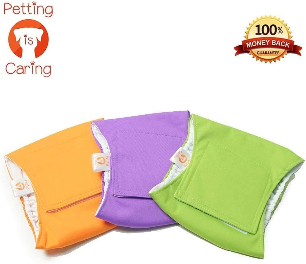 - ✔ TAMAÑO Y COLORES: PETTING IS CARING ofrece 4 tamaños diferentes para nuestras envolturas de perro masculino lavables de primera calidad. Por favor revise la imagen de la tabla de tallas para elegir el tamaño de su perro. El juego de 3 pañales de alta calidad para machos incluye una púrpura, una verde y una naranja. PETTING IS CARING Los pañales reutilizables están diseñados para la mejor experiencia de los perros, y también para su manejo rápido y fácil.